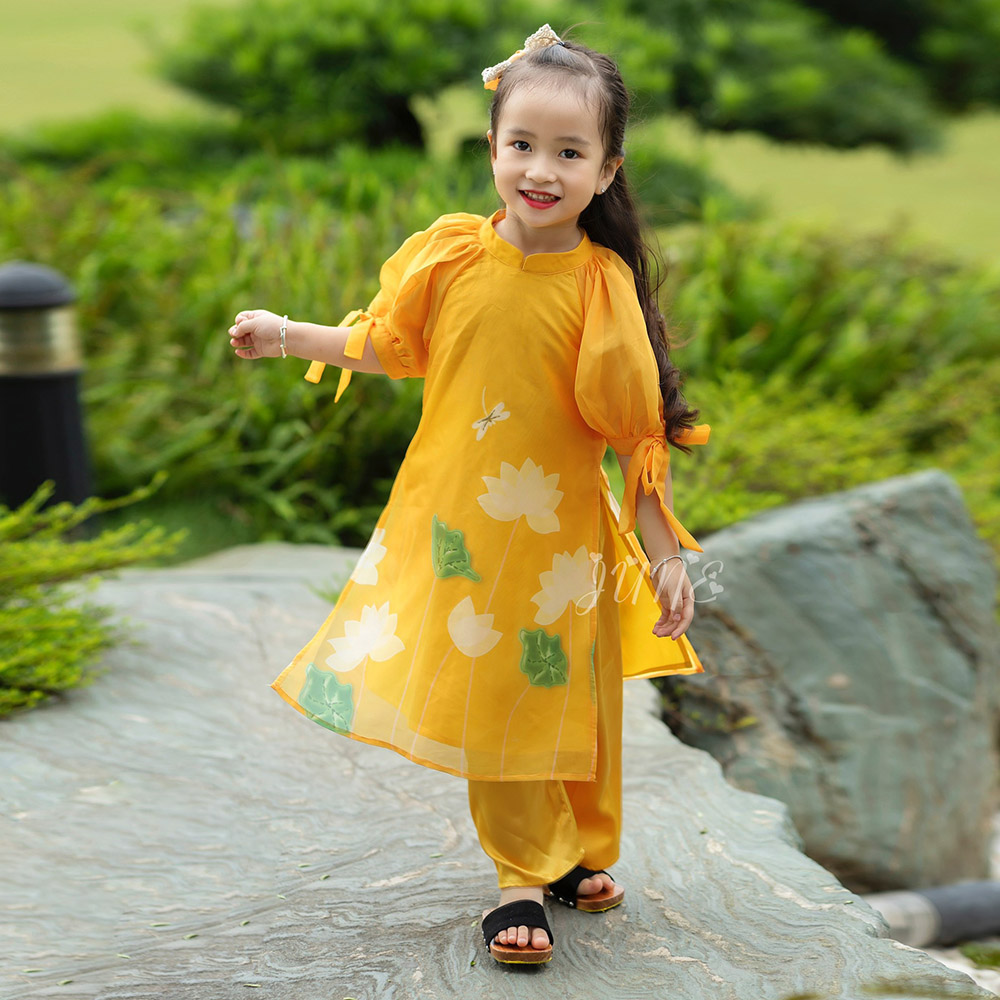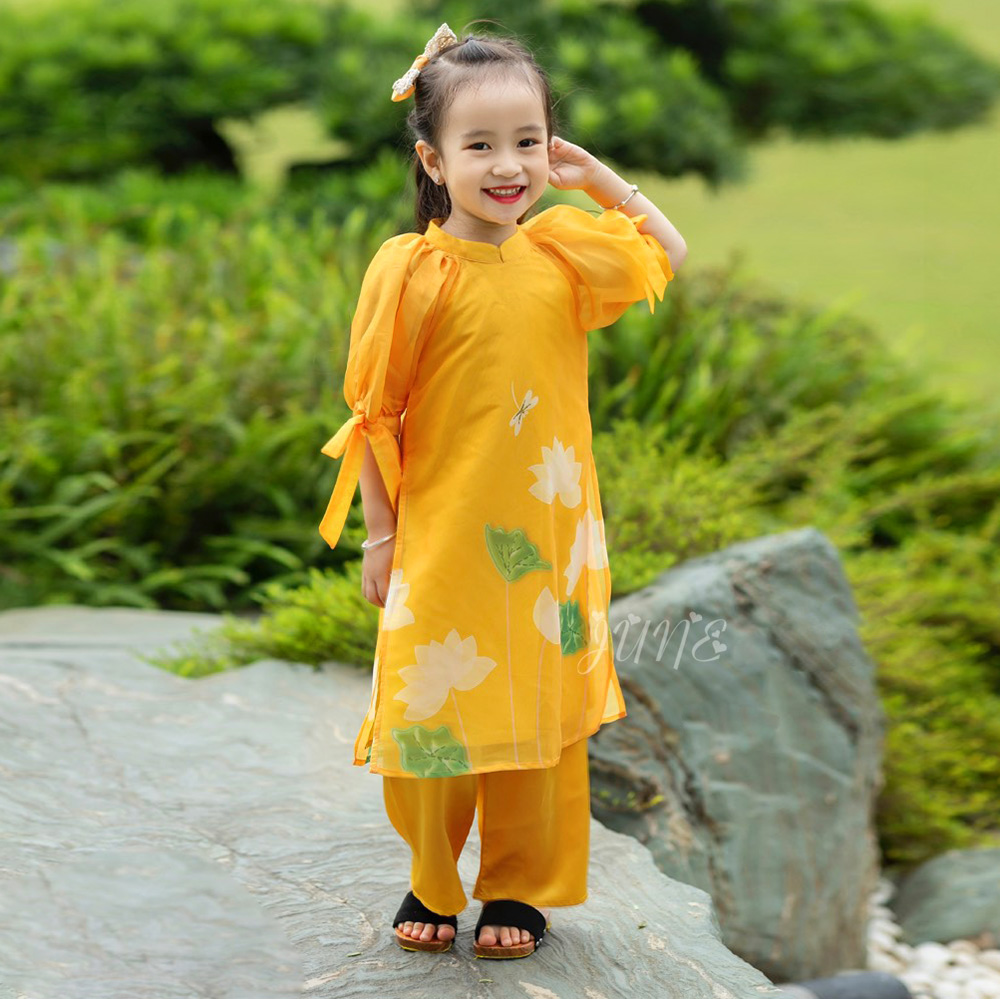 Họa tiết hoa sen gắn liền với biểu tượng của con người Việt Nam - thanh tao và tinh khiết. Áo dài truyền thống có cách tân ở tay áo, thiết kế vừa mang nét đẹp cổ điển lại vừa hiện đại, bé mặc yêu lắm ạ.