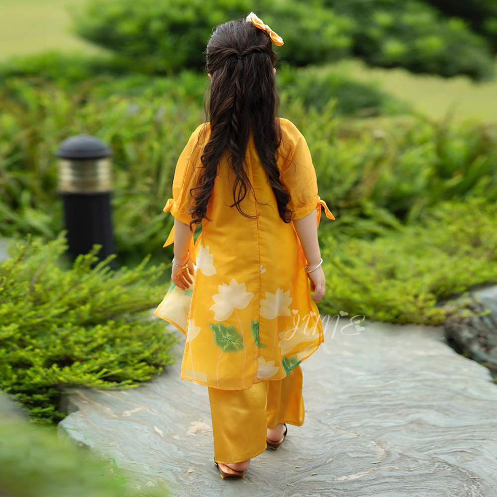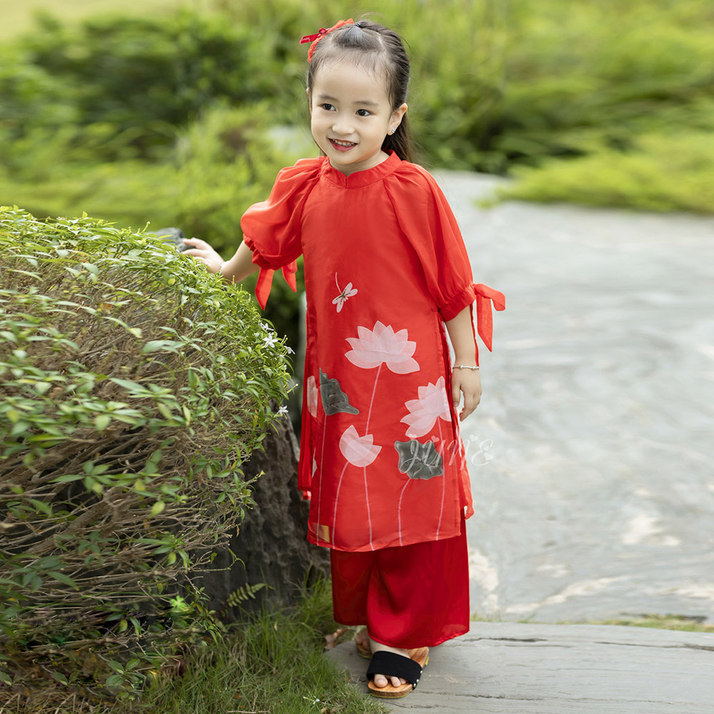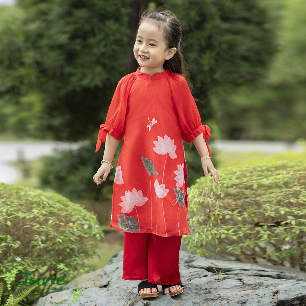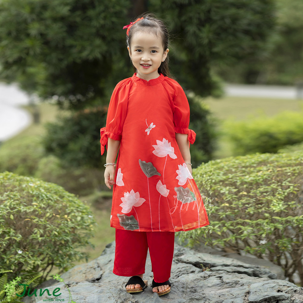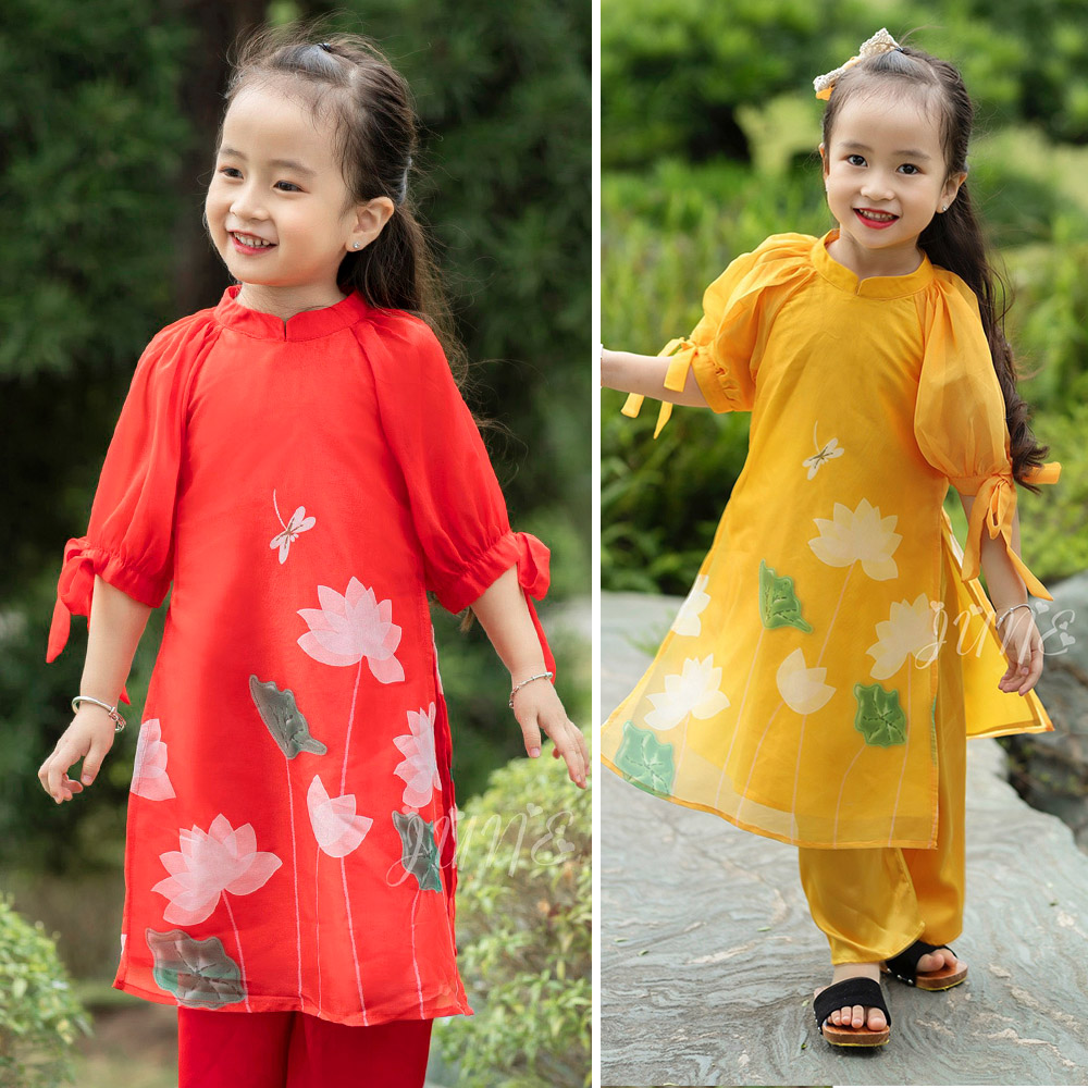 Set áo dài bé gái hoa sen với 2 gam màu đỏ - vàng dự siêu HOT.