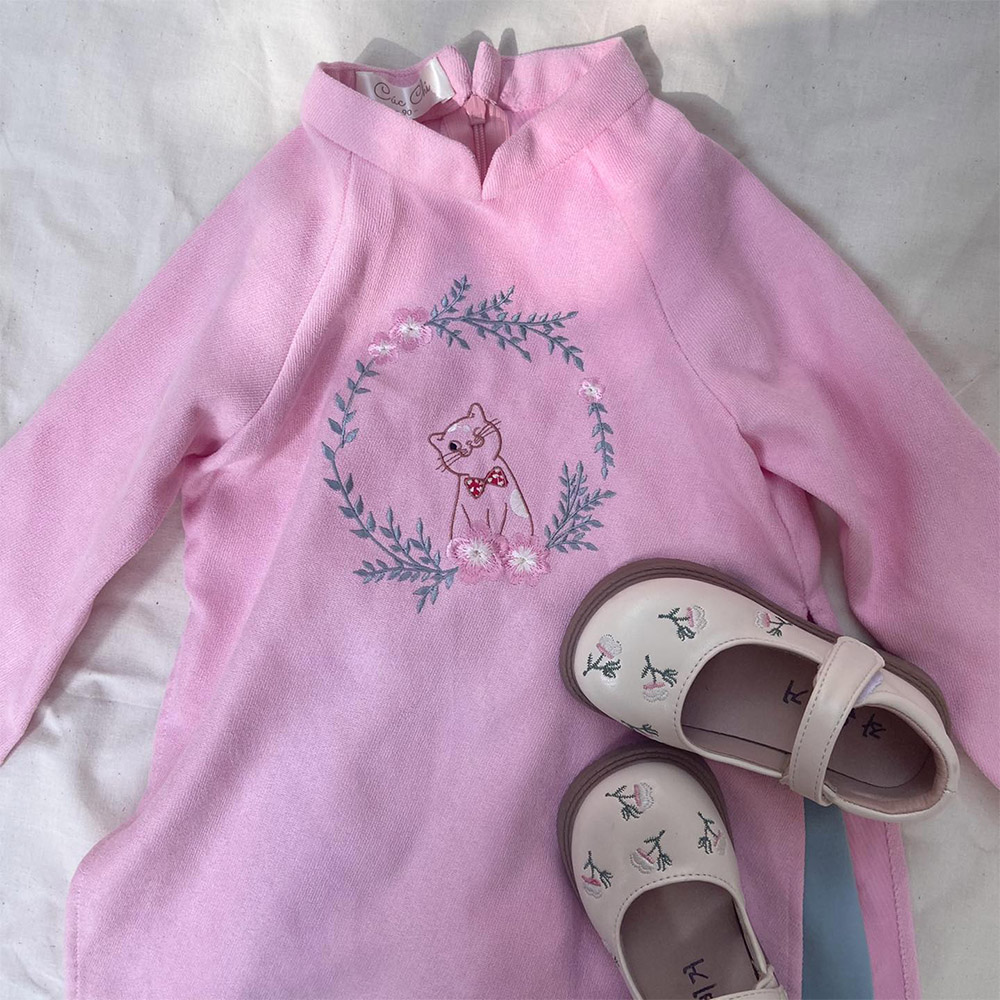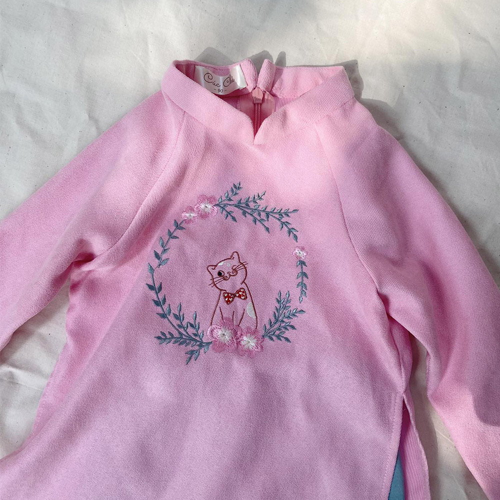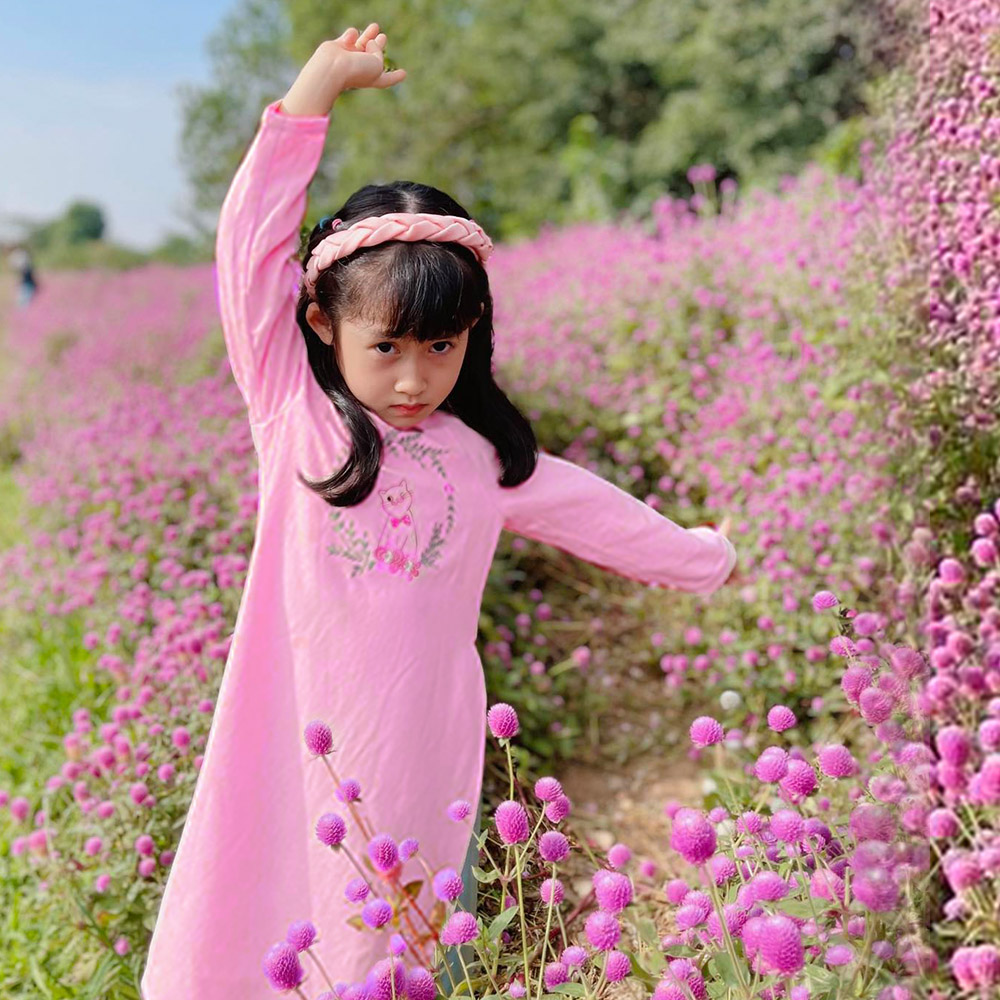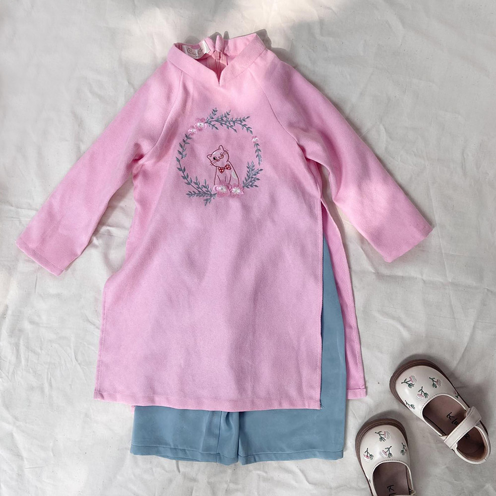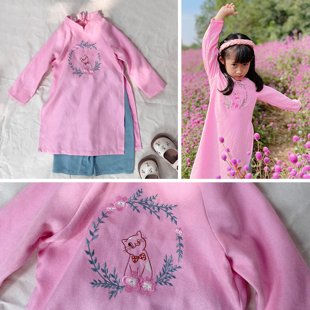 Áo dài bé gái thêu hình mèo hoa cho năm con mèo 2023, xinh xắn dễ thương.