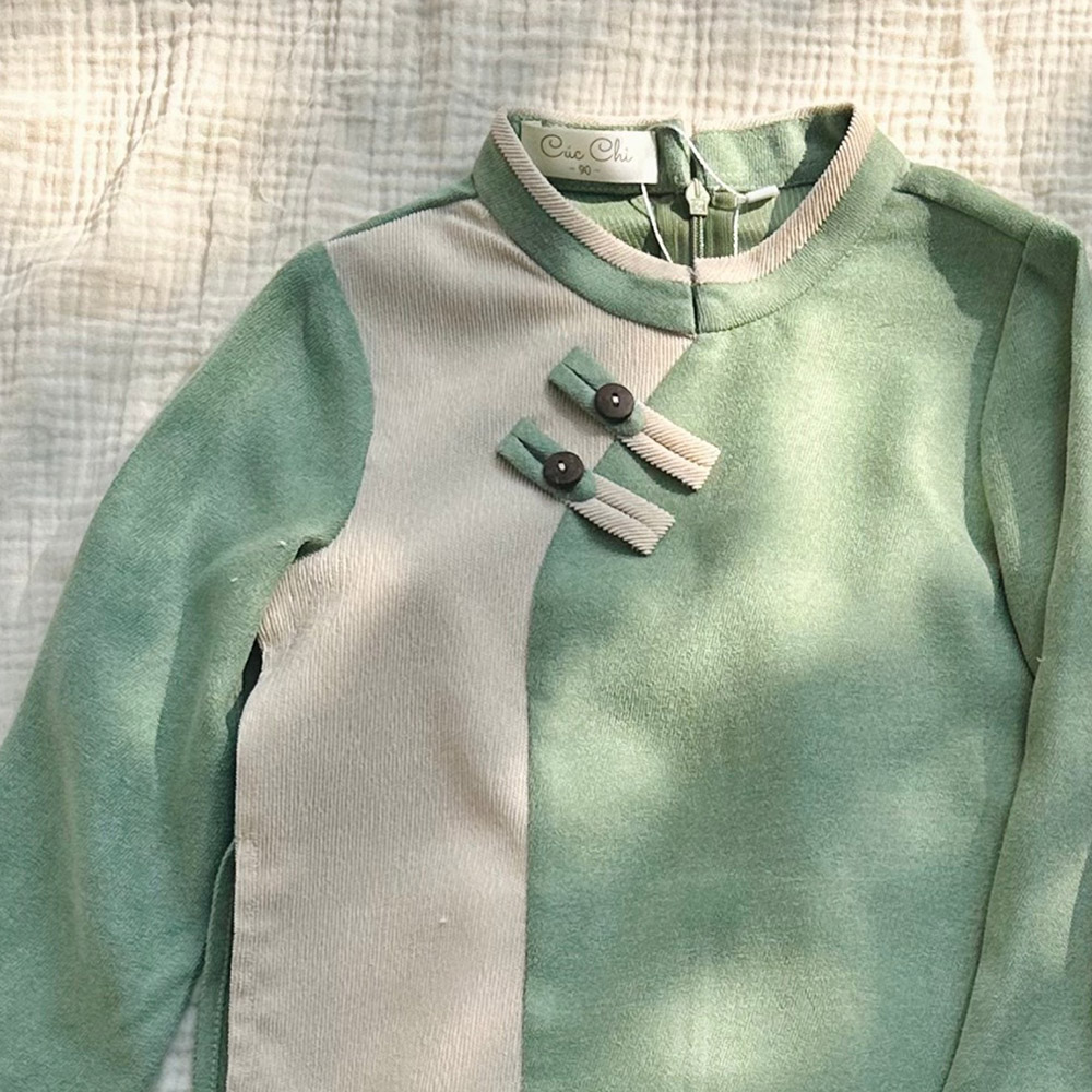 CHẤT LIỆU áo dài bé trai: Áo chất nhung mịn, quần nhung mịn dáng baggy khoẻ khoắn.