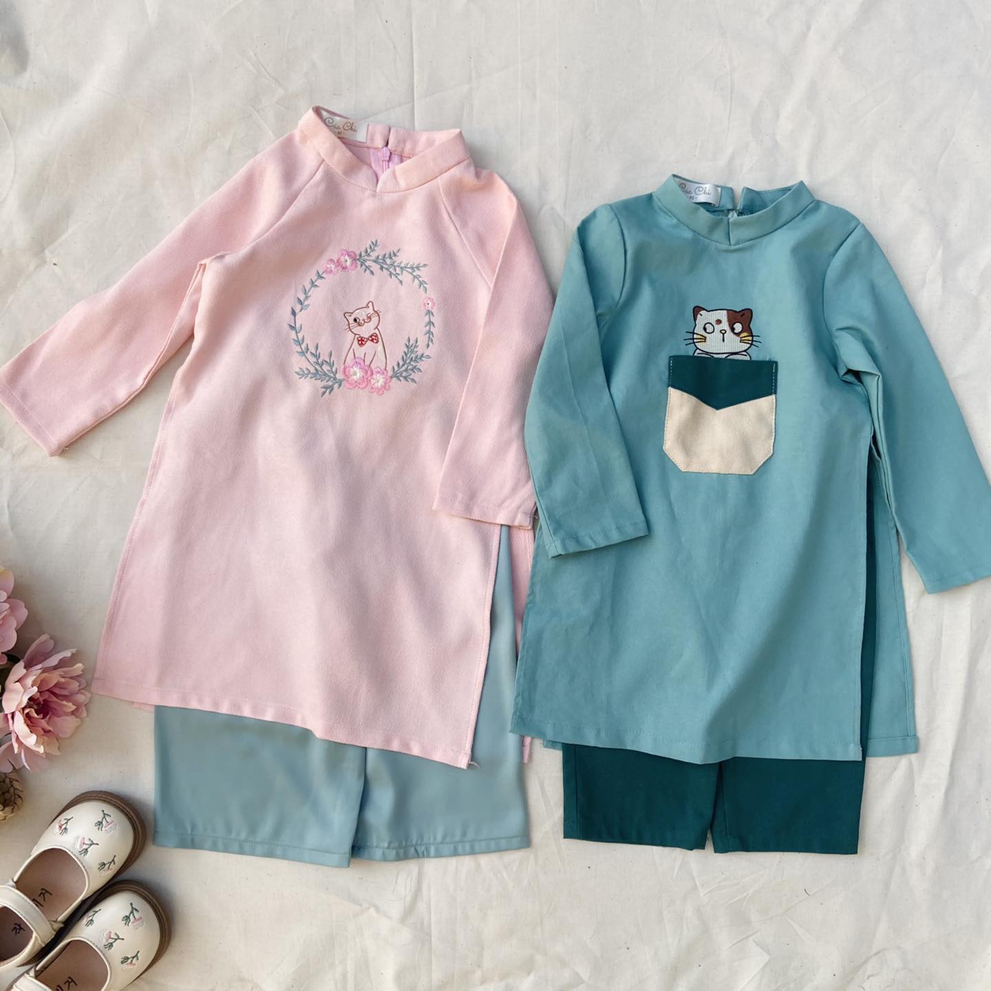Áo dài cách tân xanh ngọc thêu mèo có túi cho bé trai xinh xắn dễ thương