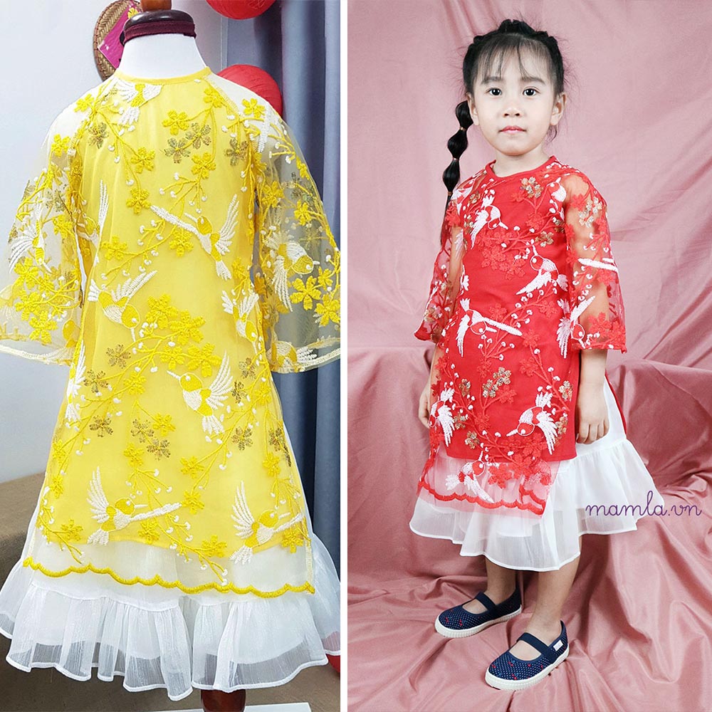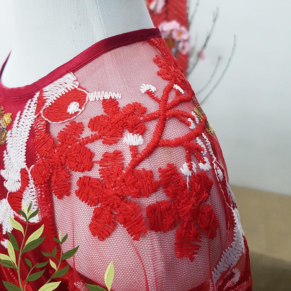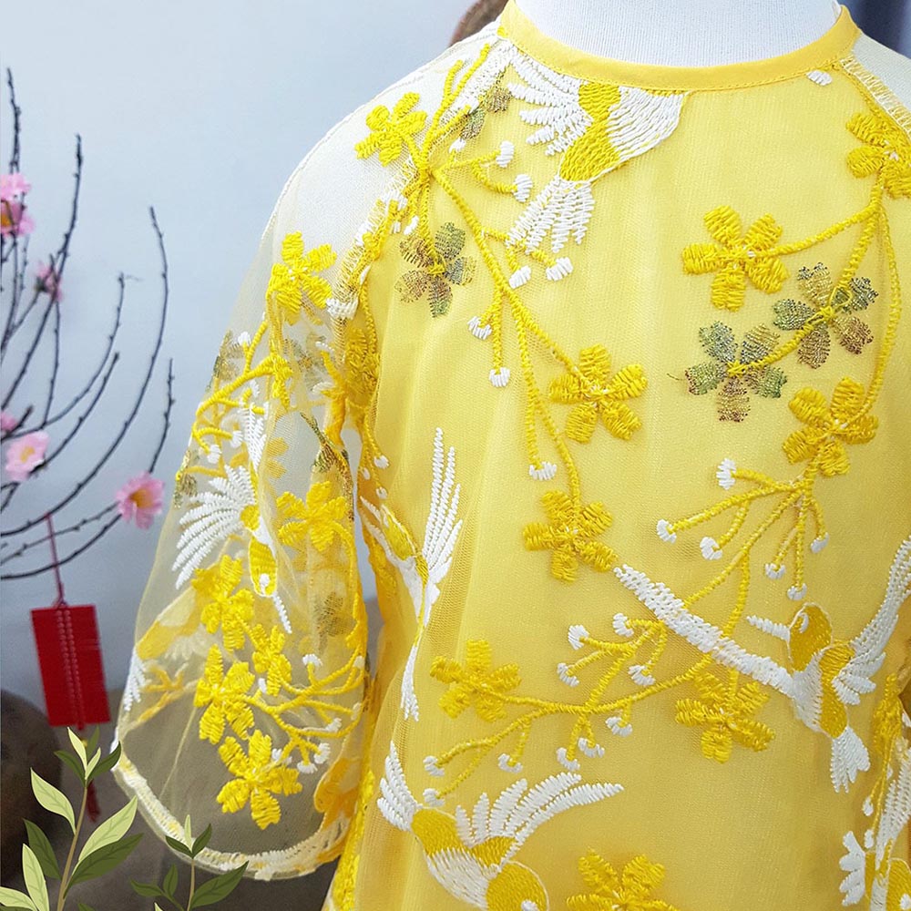 Bộ sưu tập Áo dài chim én, thiết kế tay loe, chân váy lưới tùng xoè rộng. Bản thêu ren trên nền áo dài duyệt đep. Chim én gọi xuân về, biểu tượng cho ngày tết tràn căng sức sống.