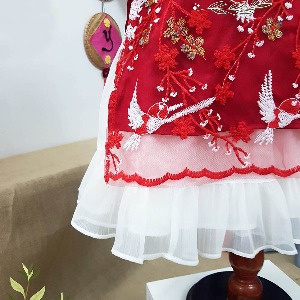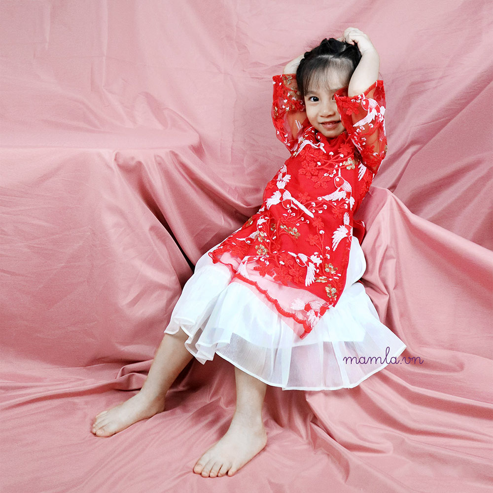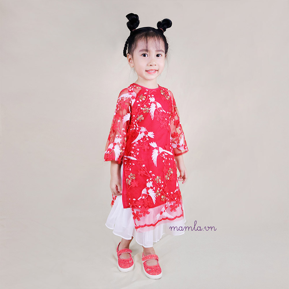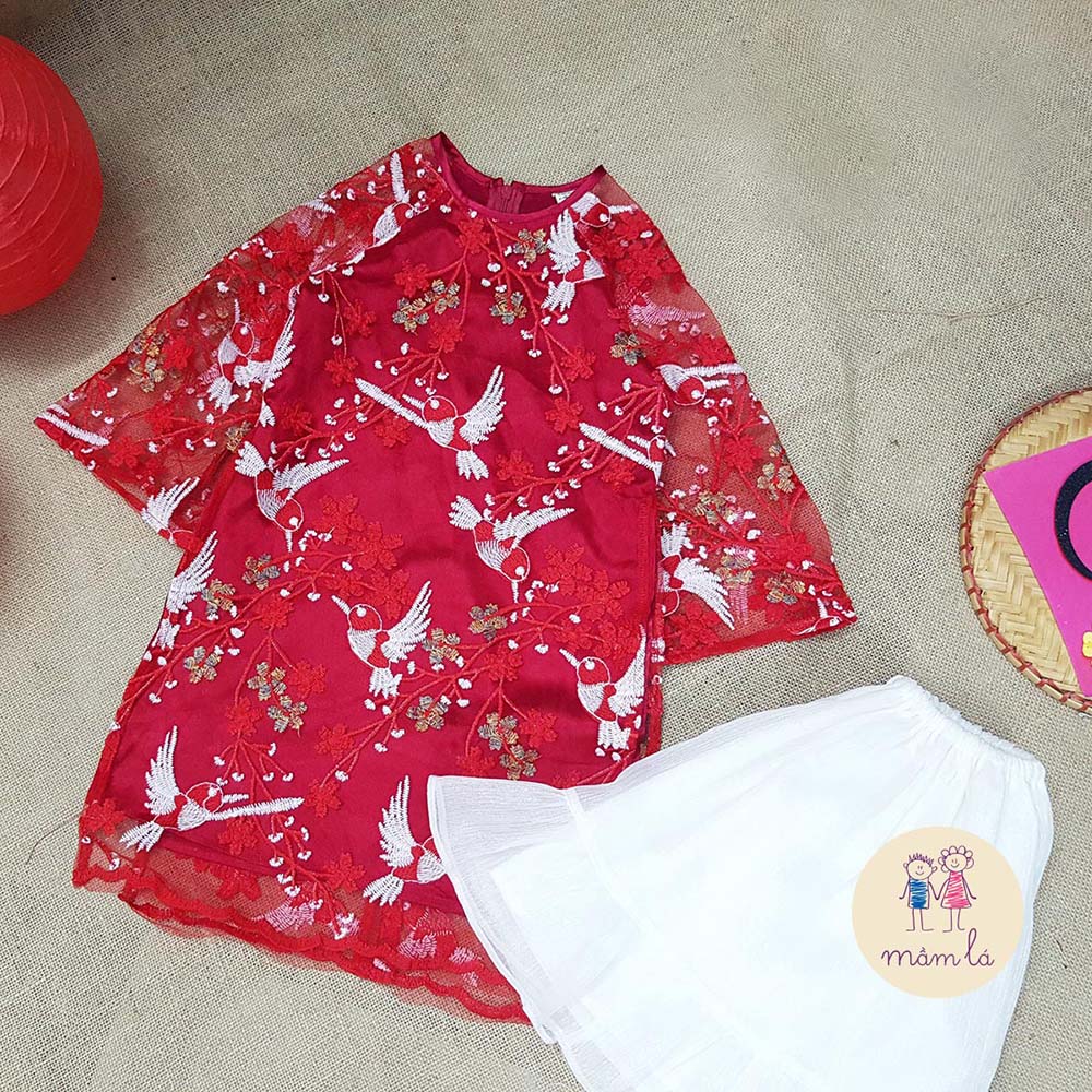 Bộ sưu tập Áo dài chim én, thiết kế tay loe, chân váy lưới tùng xoè rộng. Bản thêu ren trên nền áo dài duyệt đep. Chim én gọi xuân về, biểu tượng cho ngày tết tràn căng sức sống.