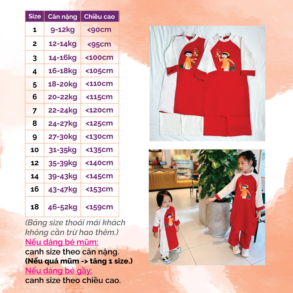 Size từ 9kg đến 52kg luôn, các bé trai gái lớn lớn không lo không tìm được áo dài nè.