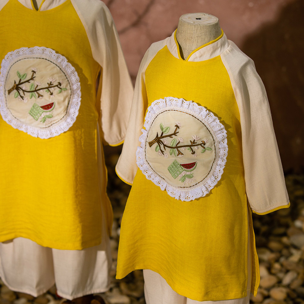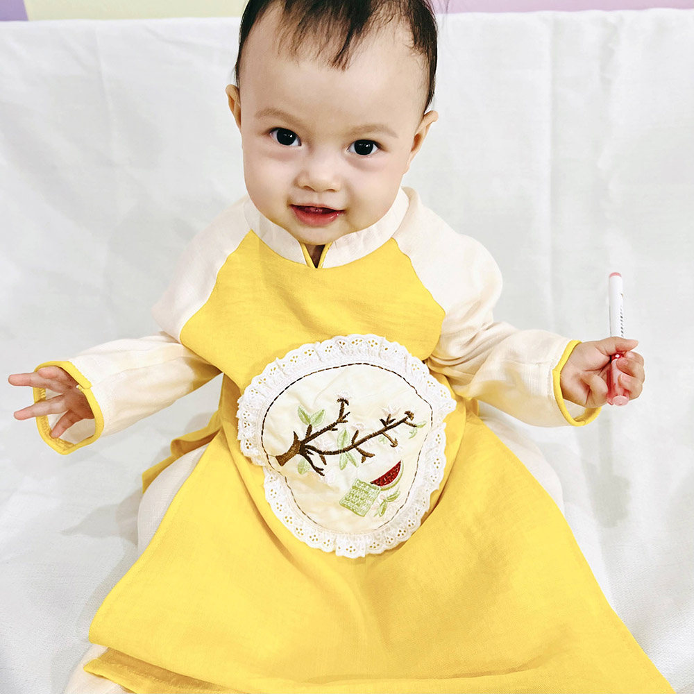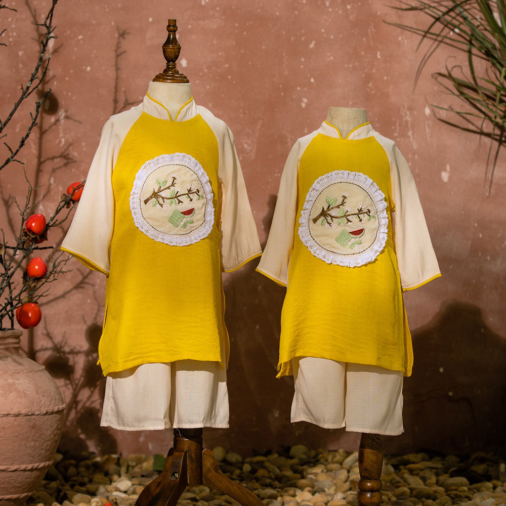 Rất đẹp và sang nhé cả nhà. Hoạ tiết thêu xinh xắn. Nhìn là thấy hoa mai rộn ràng đón Tết sang rồi. hihi. Chất liệu đũi phối lụa vân mây mềm mại, mịn, mát. Phù hợp với thời tiết cả 2 miền Nam Bắc ạ