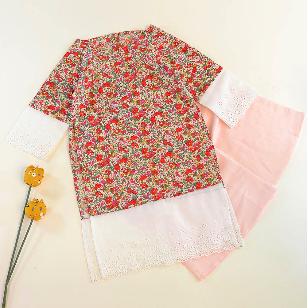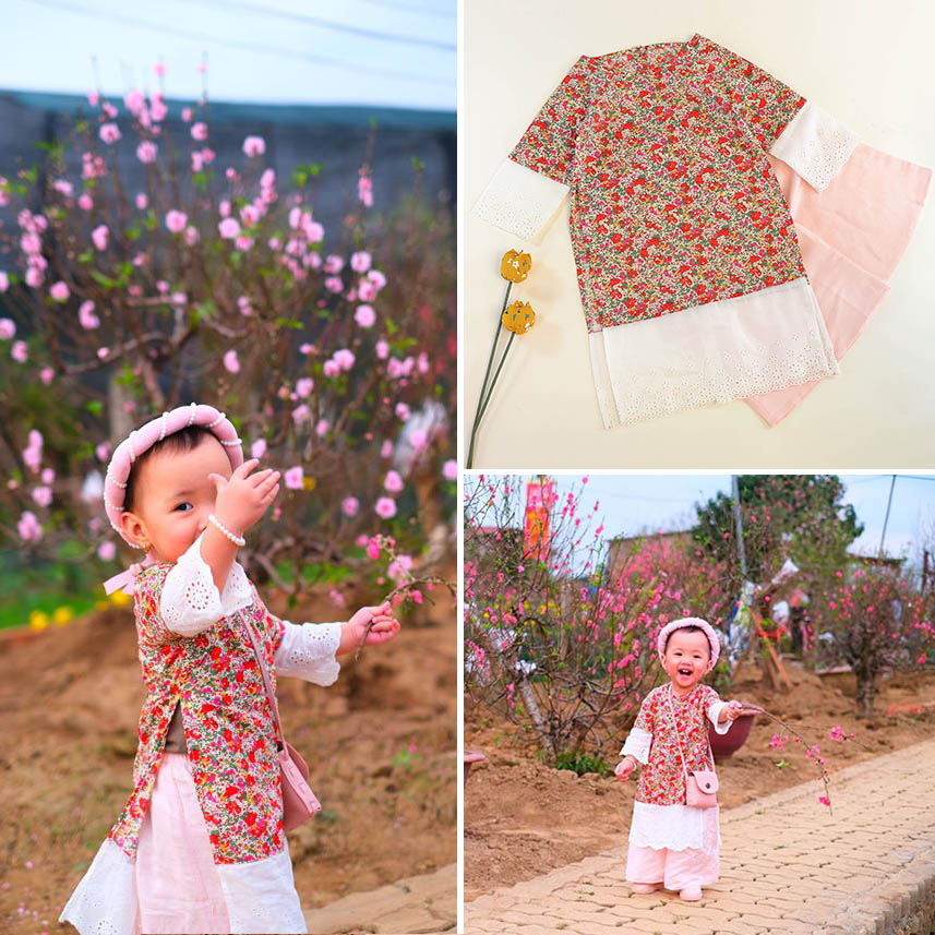 Áo dài lên từ chất liệu vải thô cotton 100% mềm mịn. Hoạ tiết hoa nhí tông đỏ nổi bật tôn lê nét đáng yêu của "nàng bé". Quần dài chất linen ướt hết sức êm da, có hai màu hồng phấn và trắng.