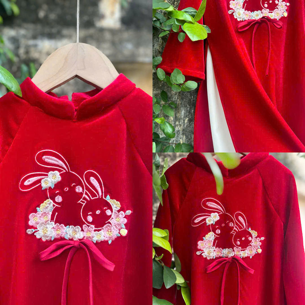 Bộ áo dài Út Hoa thêu Thỏ Ngọc dễ thương + quần lụa suông. Màu đỏ truyền thống.