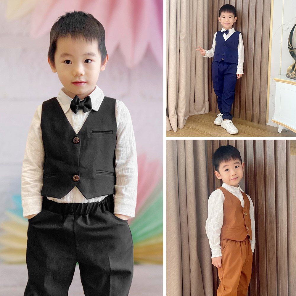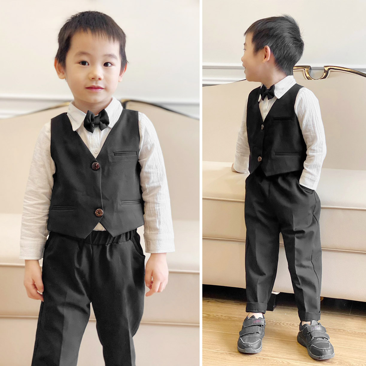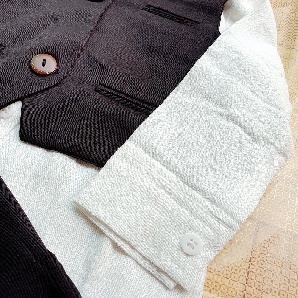Set gồm 4 chi tiết: áo sơ mi, áo gile, quần và nơ.
