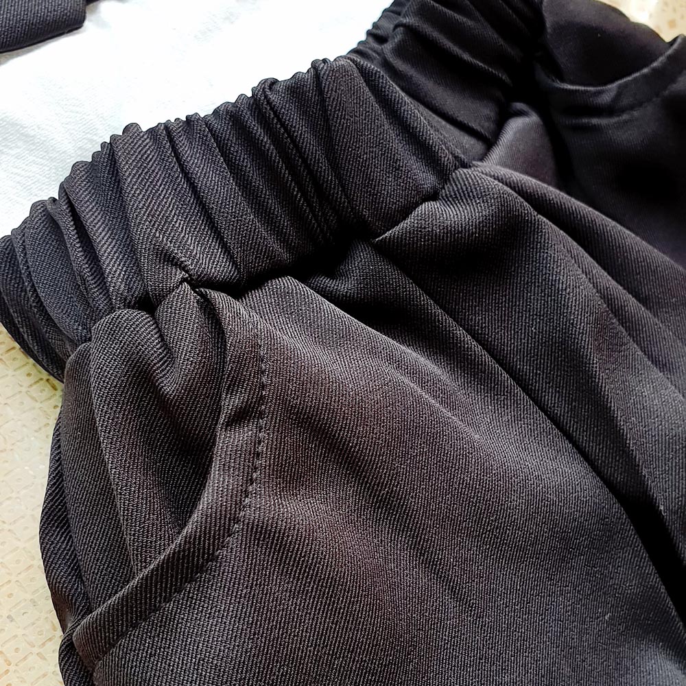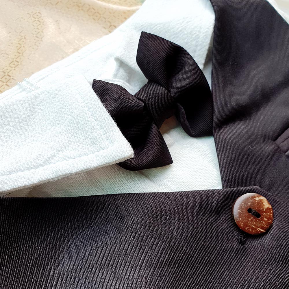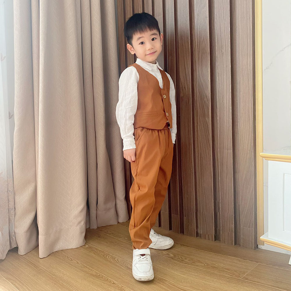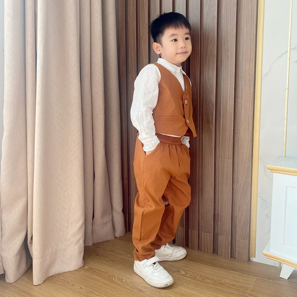 Set gồm 4 chi tiết: áo sơ mi, áo gile, quần và nơ.