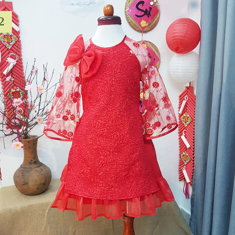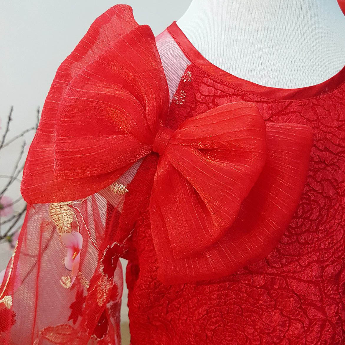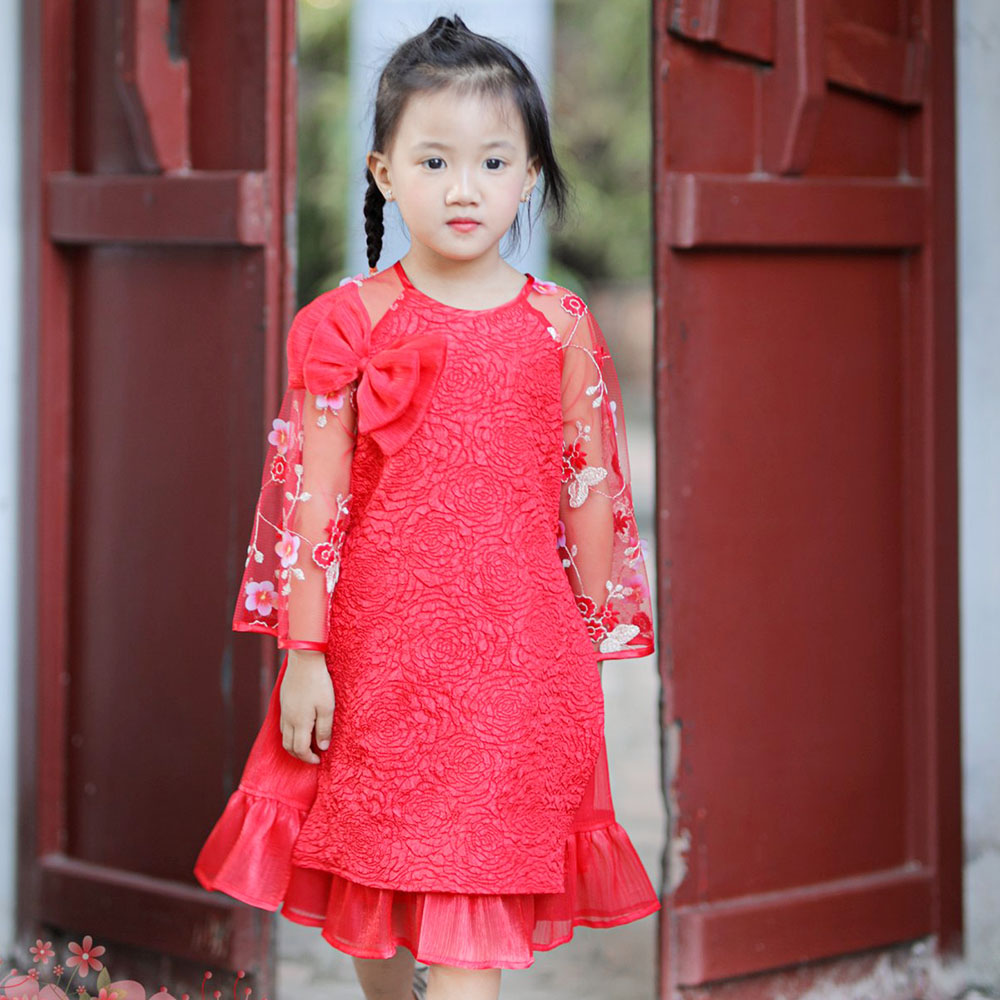 Sắc đỏ ngập tràn. Áo dài cách tân siêu xinh trên nền vải xốp 3D sang chảnh, thiết kế tay điệu đà thêu và gắn hoa nổi, viền cửa tay phi bóng, tùng váy bồng bềnh xúng xính cho bé yêu diện Tết thật nổi bật. Điểm nhấn chiếc nơ xinh xắn siêu sang chảnh.