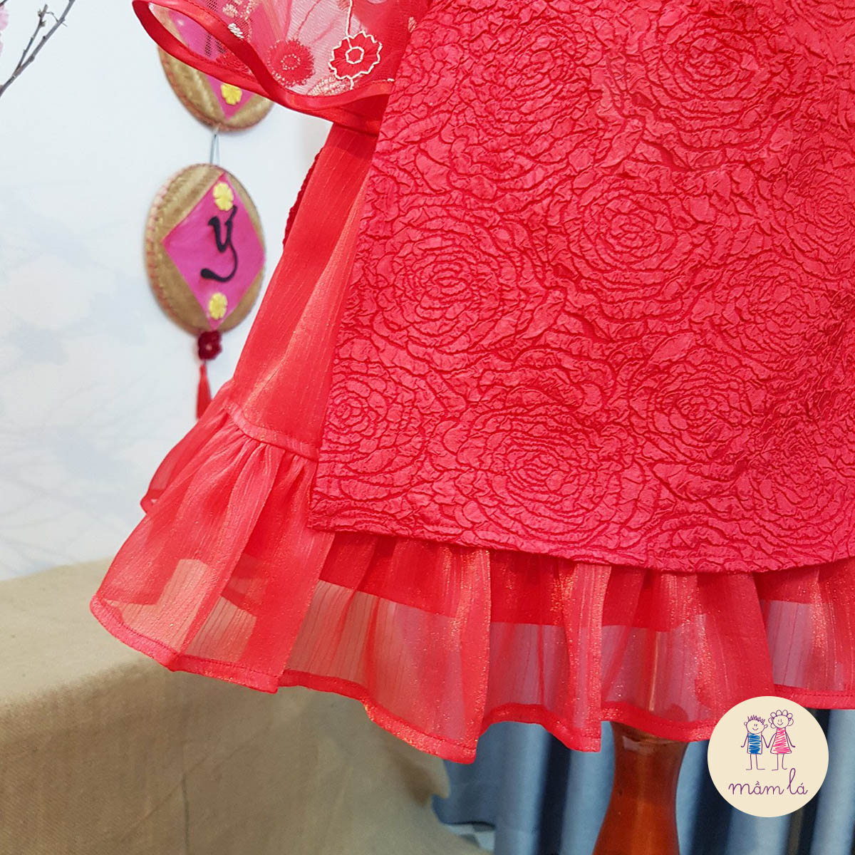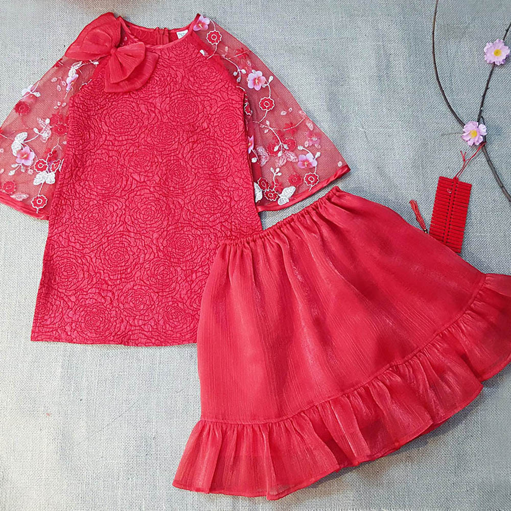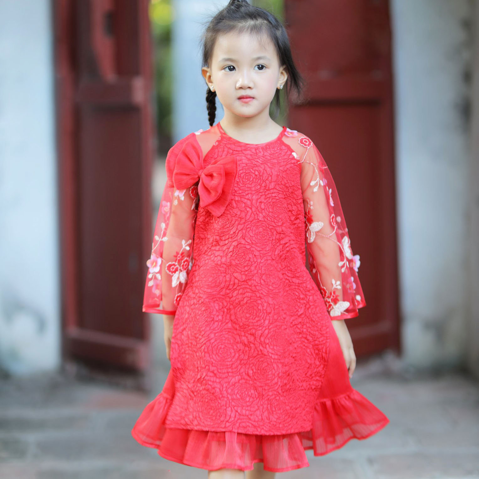 Sắc đỏ ngập tràn. Áo dài cách tân siêu xinh trên nền vải xốp 3D sang chảnh, thiết kế tay điệu đà thêu và gắn hoa nổi, viền cửa tay phi bóng, tùng váy bồng bềnh xúng xính cho bé yêu diện Tết thật nổi bật. Điểm nhấn chiếc nơ xinh xắn siêu sang chảnh.