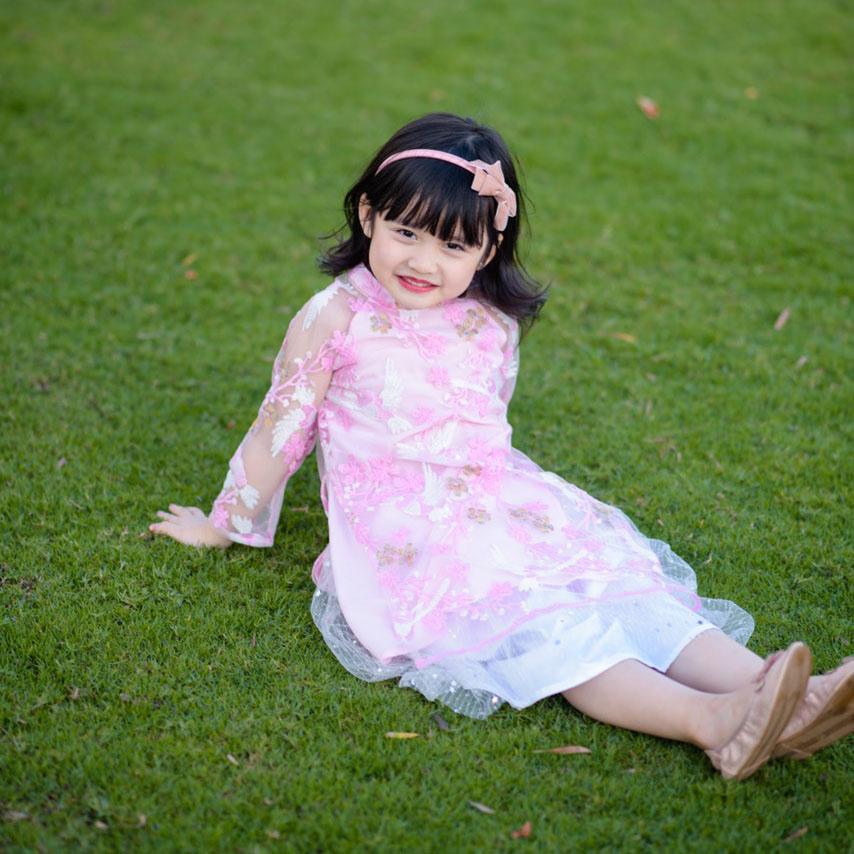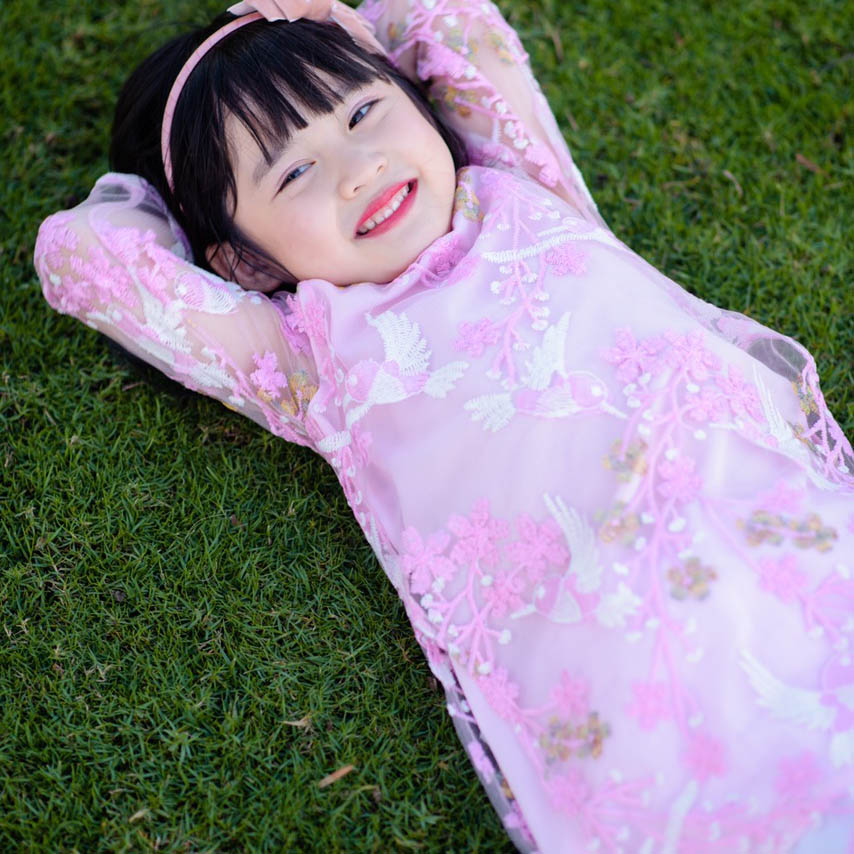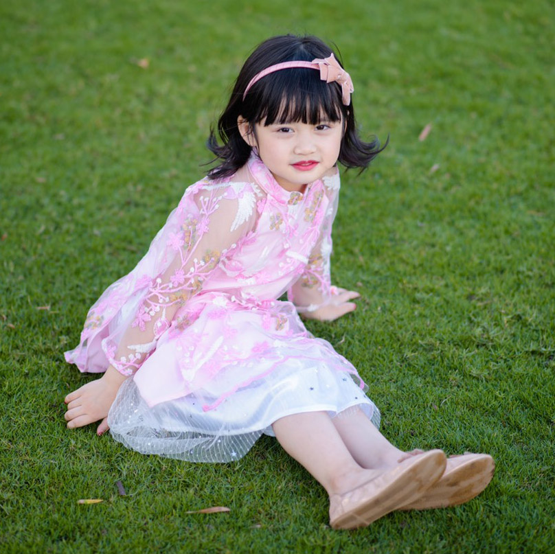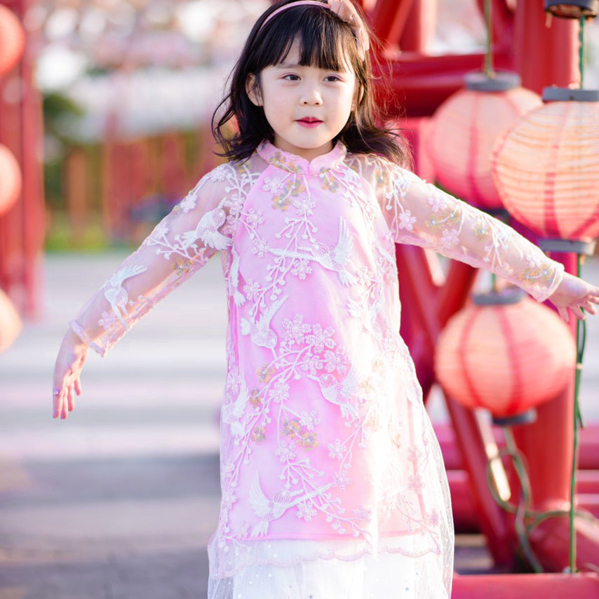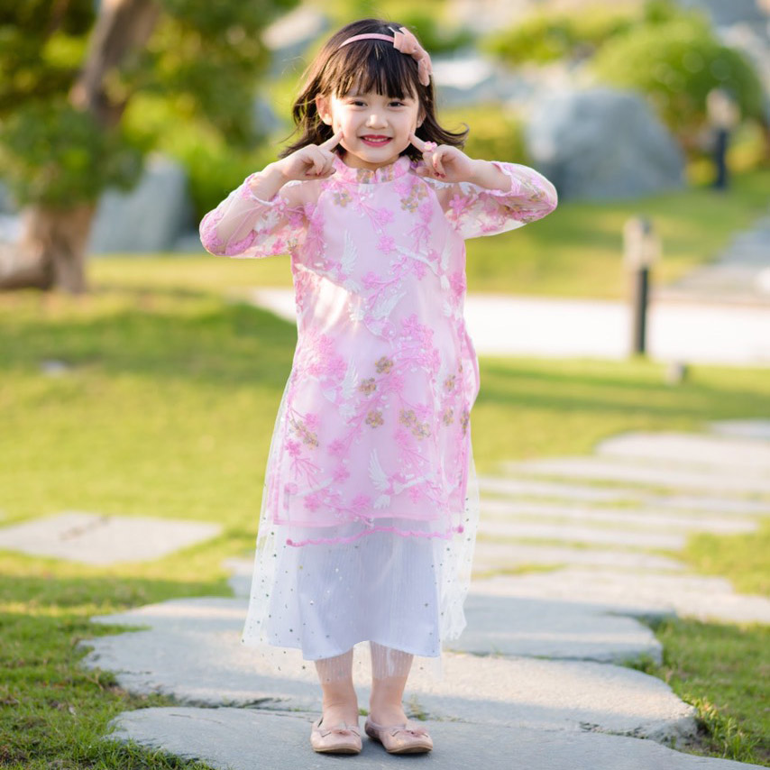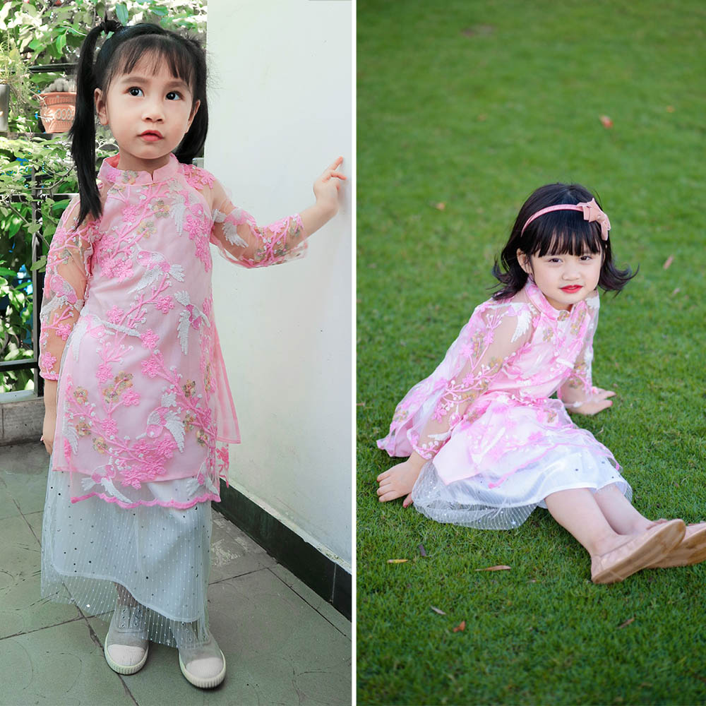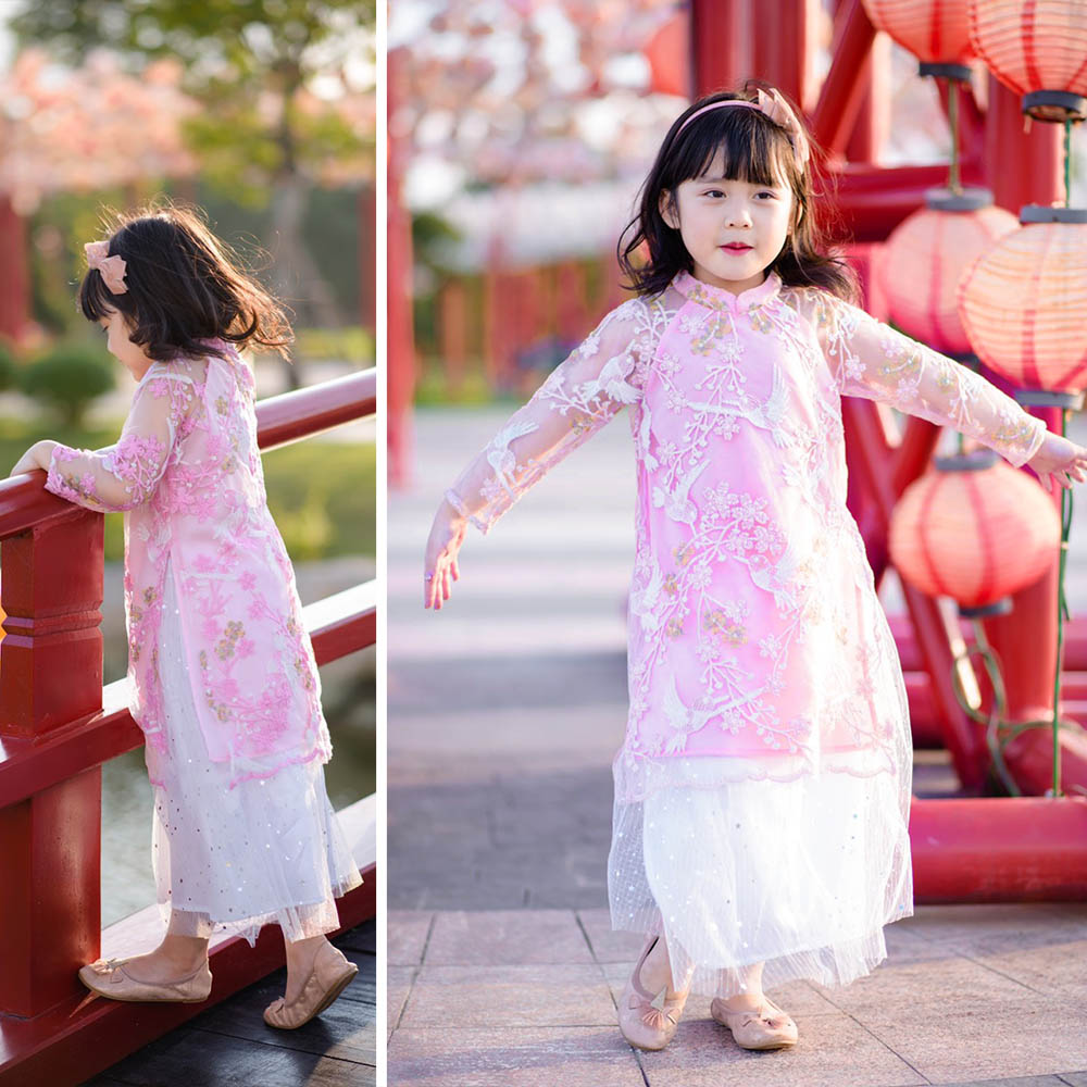 Áo dài bé gái cách tân chất liệu ren thêu cực xịn sò. Chân váy lụa mềm mại phủ tutu sao lấp lánh cực xinh.