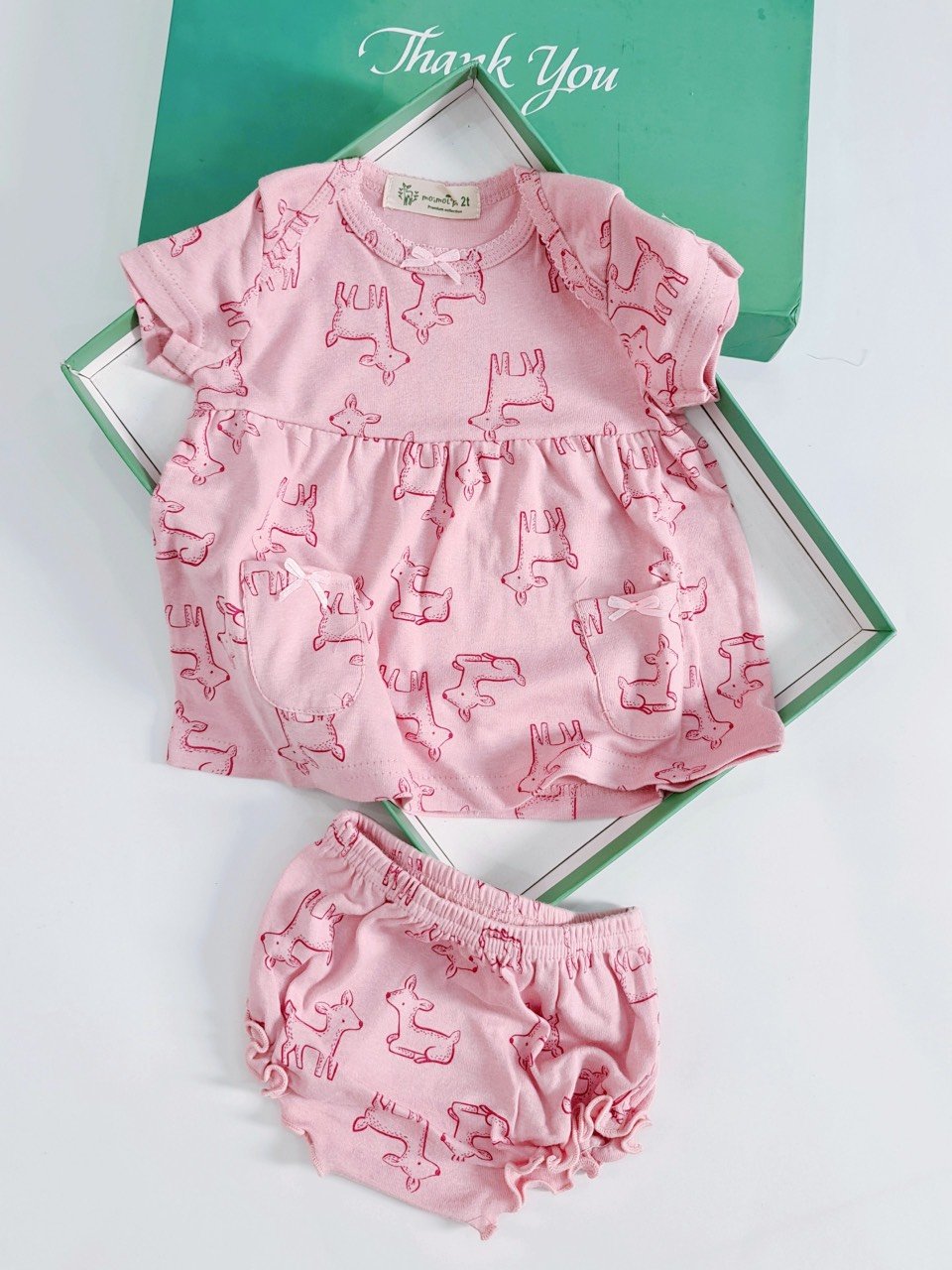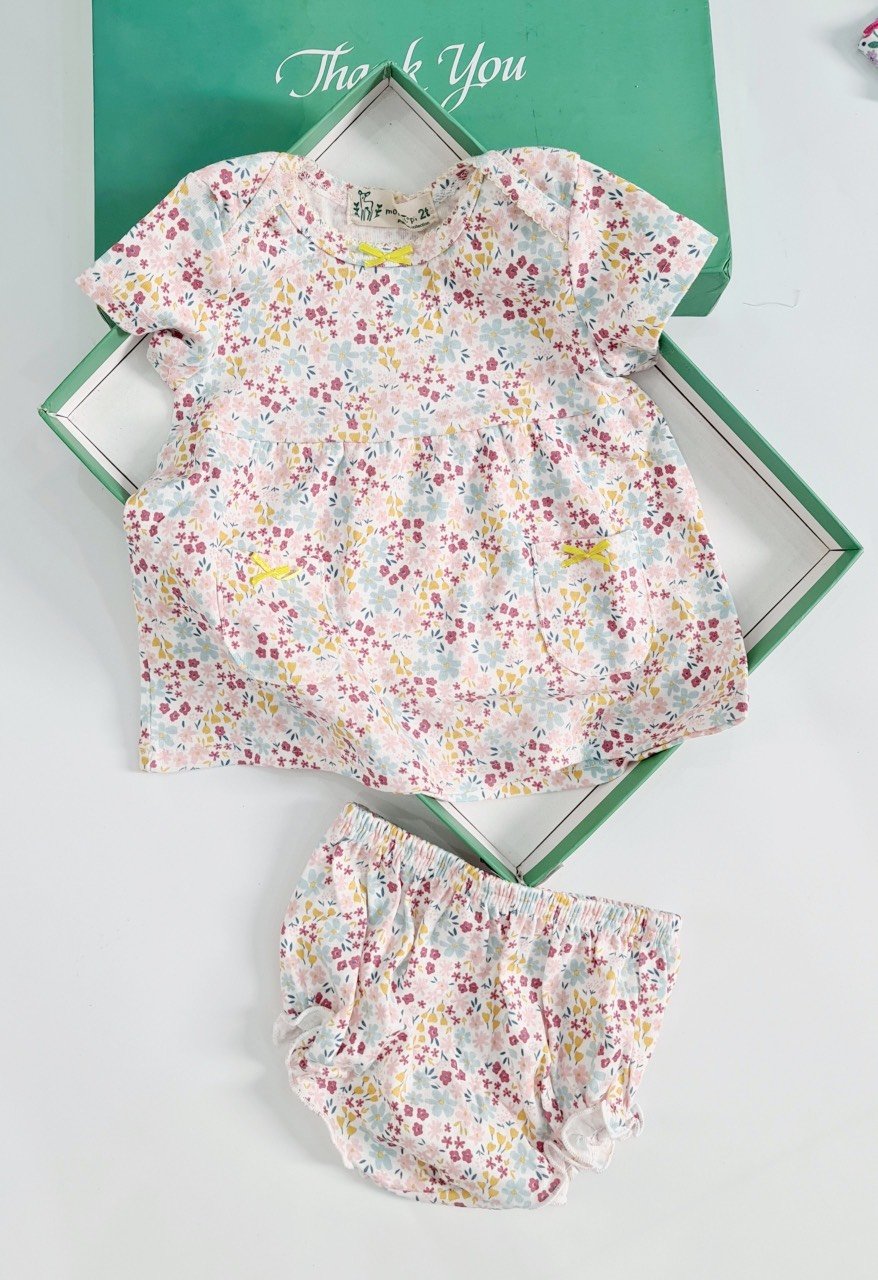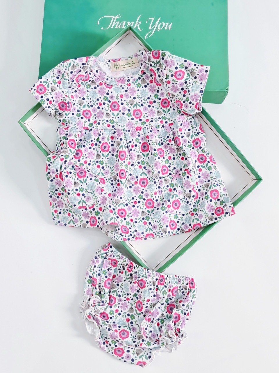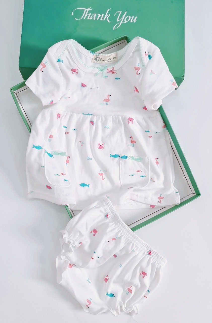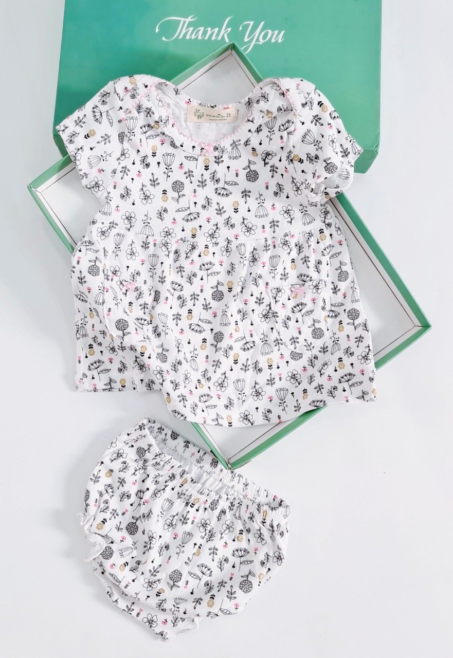 Áo váy dáng babydoll có 2 túi đính nơ dễ thương, quần chip phồng uốn viền siêu cưng.