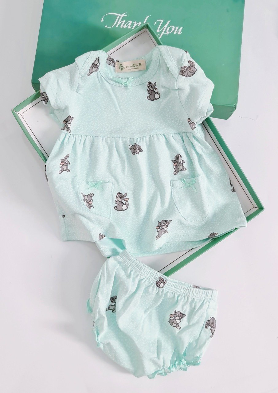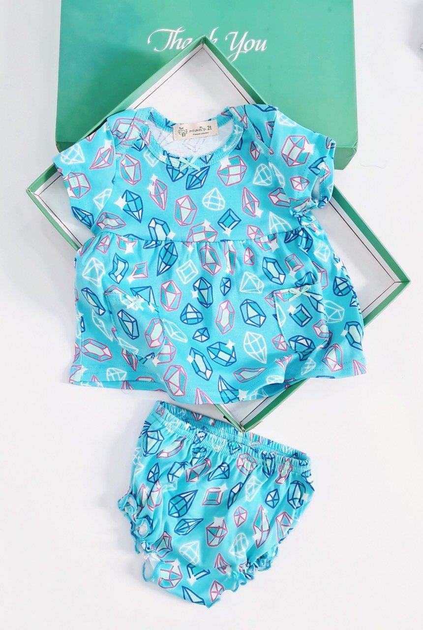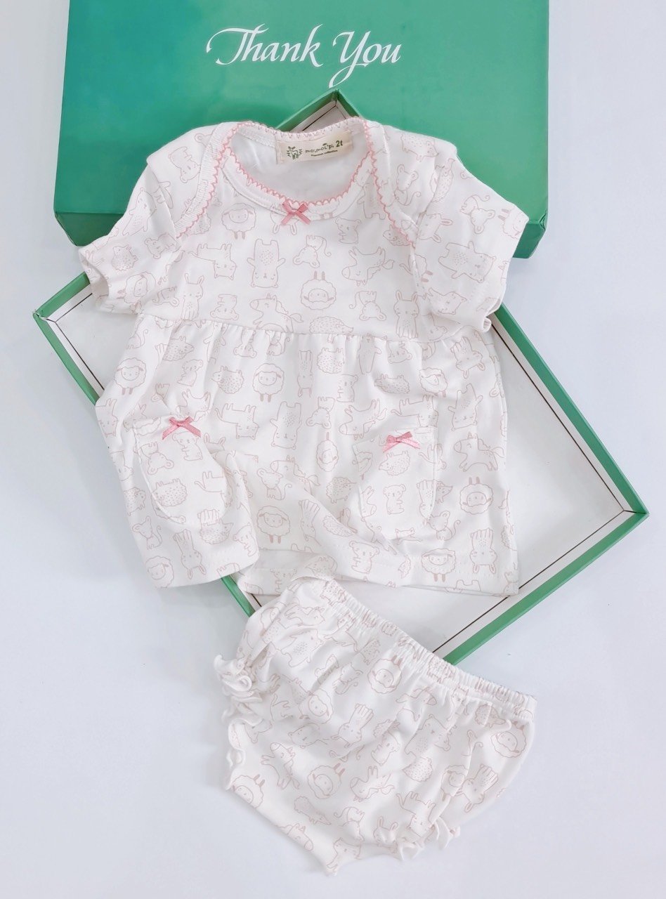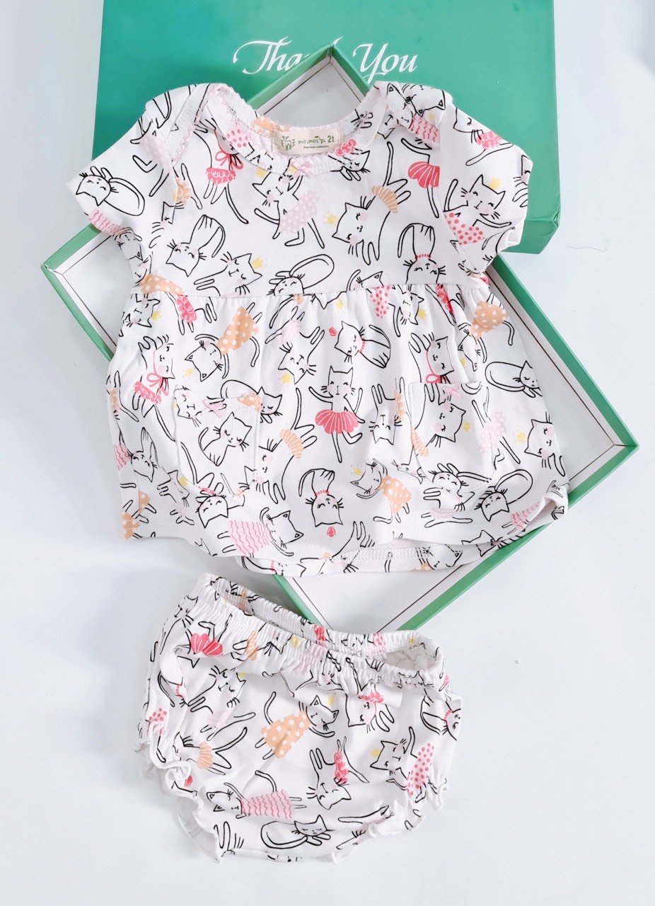 Áo váy dáng babydoll có 2 túi đính nơ dễ thương, quần chip phồng uốn viền siêu cưng.