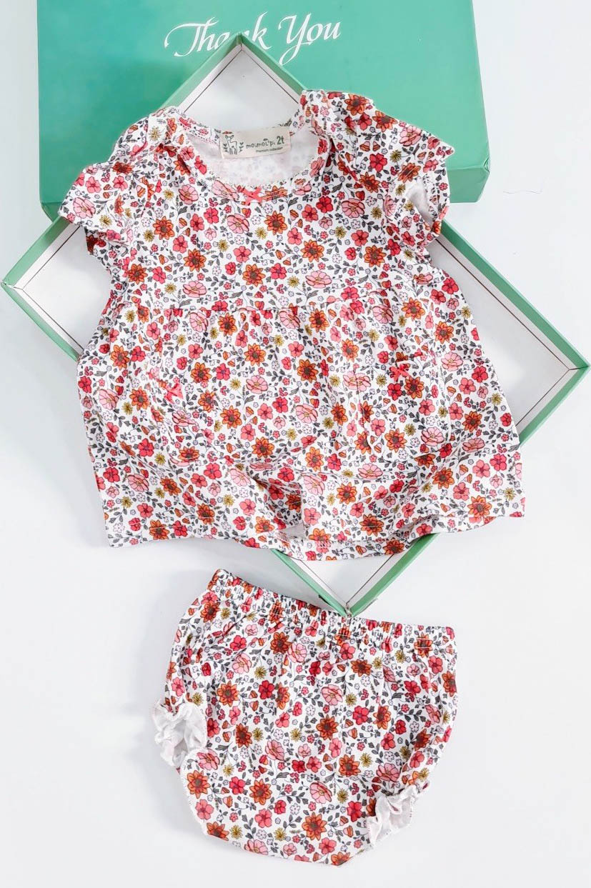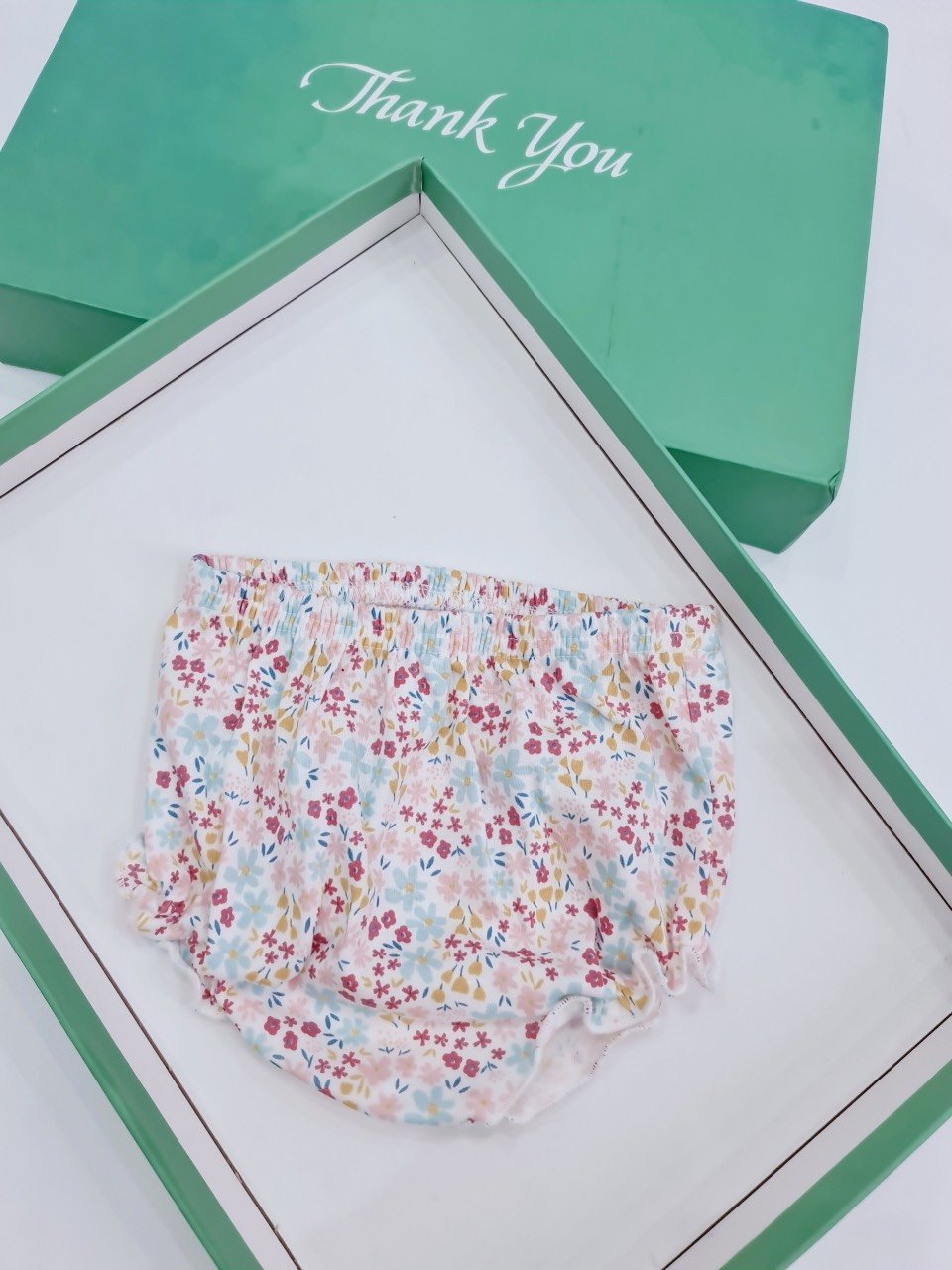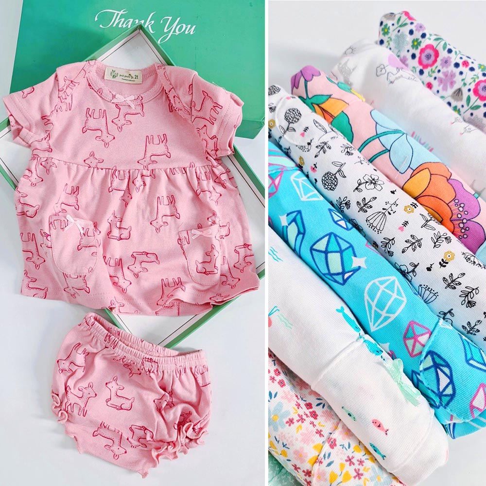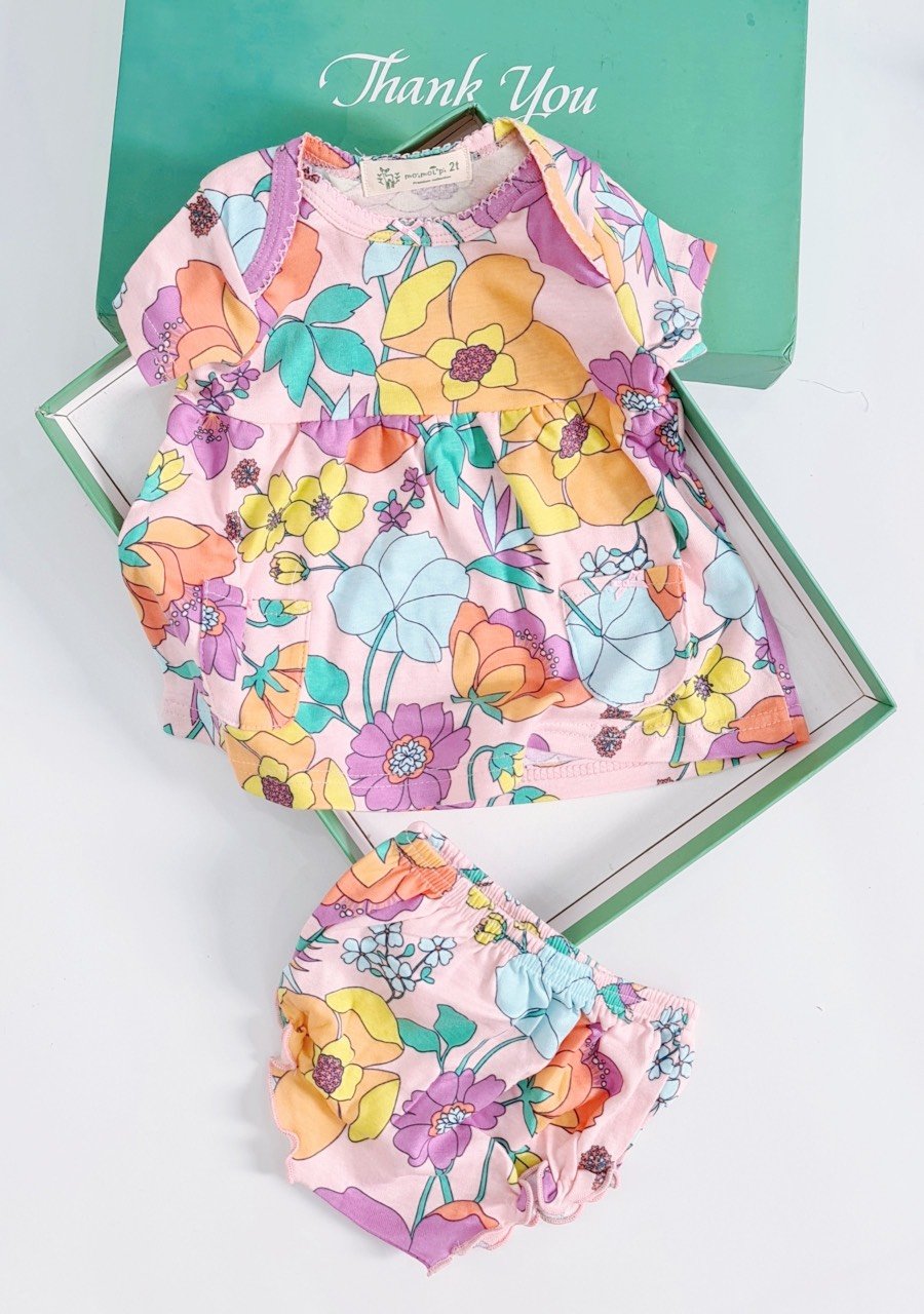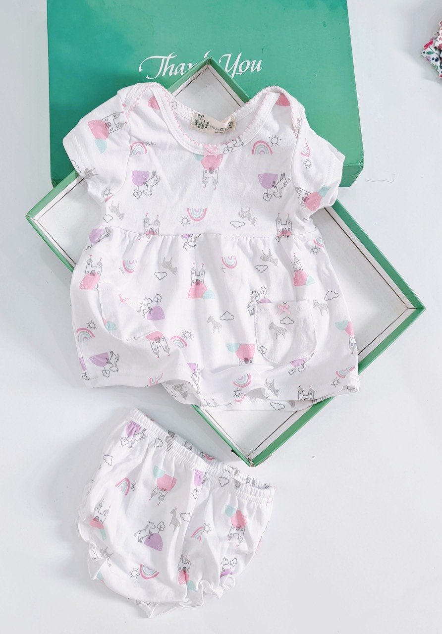 Áo váy dáng babydoll có 2 túi đính nơ dễ thương, quần chip phồng uốn viền siêu cưng.